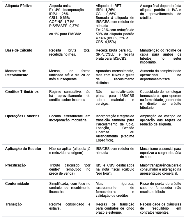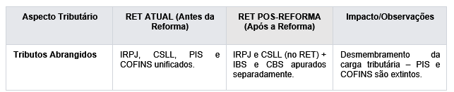 O Regime Especial de Tributação (RET), que atualmente unifica IRPJ, CSLL, PIS e COFINS em uma alíquota única sobre a receita bruta para incorporações imobiliárias, será mantido para os empreendimentos já enquadrados ou que optem pelo RET até 31 de dezembro de 2028, para aplicação até o final do empreendimento. Após a Reforma Tributária o IBS e a CBS incidirão por fora do RET, ou seja, IRPJ e CSLL permanecem no RET, enquanto IBS e CBS serão apurados e recolhidos separadamente sobre o consumo.